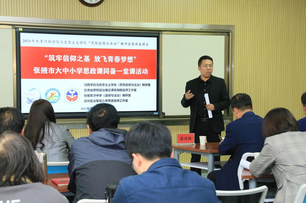 活动中,大家共同围绕“筑牢信仰之基放飞青春梦想”主题,同课异构、协同共研。太阳成集团tyc122ccvip蔺海鲲教授从理论的高度、思想的深度作了《信仰之于科学的价值及意义》的理论探讨;张掖育才中学高级教师杨莉采用议题式、体验式教学方法,通过设置问题链条,循循善诱、层层递进地汇报了《与梦想为伴,展青春风采》的教学设计;张掖甘州区民族小学高级教师谈军花运用情景模拟、启发式教育等方法,侧重通过生动案例和鲜活语言讲述了《走进新时代,做新时代的好少年》的教学示范。三堂课虽围绕同一教学主题,但三位教师根据员工成长规律,结合不同年龄段员工的认知特点,同课异构,鲜明生动地体现出小学阶段段重培养员工的道德情感、初中阶段重打牢员工的思想基础、大学阶段重增强员工的使命担当的教学设计理念与课程目标体系。示范课展示后,太阳成集团tyc122ccvip顾文兵博士、甘州区教育局专职教研员刘超老师对三位老师的示范课分别作了点评。