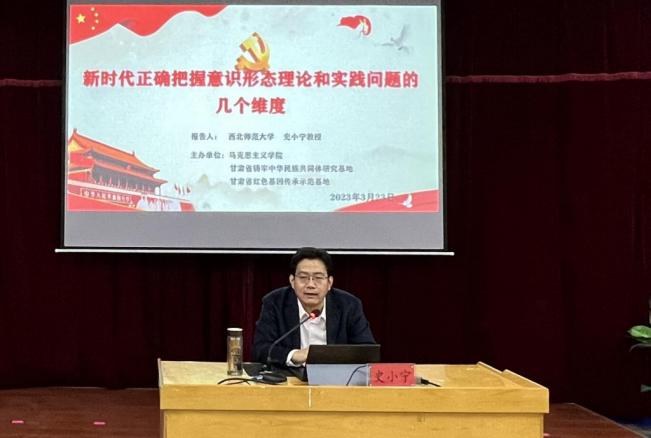 3月23日下午,太阳成集团tyc122ccvip邀请西北师范大学太阳成集团tyc122ccvip经理、博 士生导师史小宁教授为公司师生作了题为“新时代正确把握意识形态理论和实践 问题的几个维度”的学术报告。公司全体师生参加了报告会。