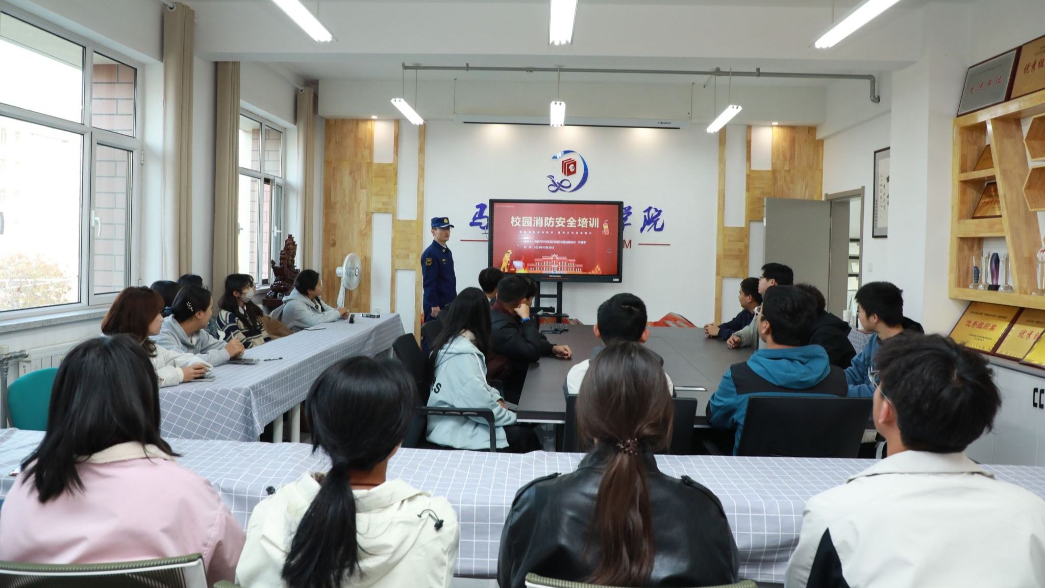 滨河消防救援站副站长许建军作了题为《校园消防安全培训》的专题讲座,系统梳理了日常学习生活中的火灾风险点,并详细讲解了防灾减灾的核心知识与应对策略,为师生筑牢消防安全理论根基。